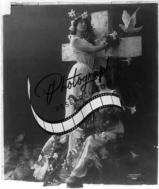 Decorative studio showing 2 women at cross with lyre,lilies,dove,1900-1910