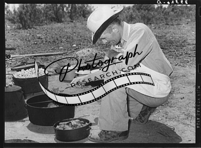 Title: Cowboys of the SMS Ranch serving themselves at dinner at chuck wagon. Ranch near Spur, Texas