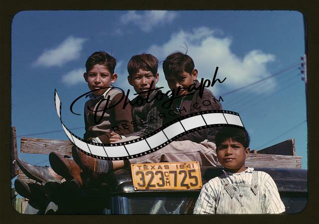 Boys sitting,truck parked,automobiles,children,FSA labor camp,Robston,Texas,1942