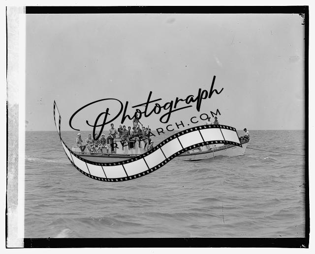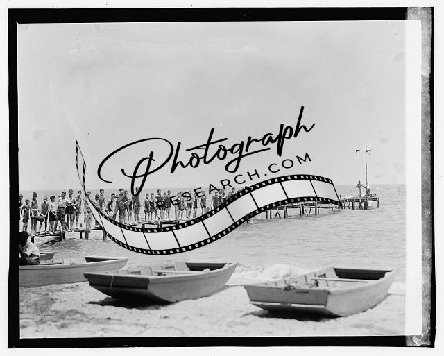 Group of boys on pier; beach with dinghys in foreground,7/30/23,July 1923