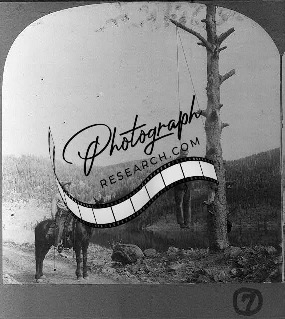 What the sheriff found, Photograph shows staged hanging of stage coach robber from tree; sheriff observes from horseback.