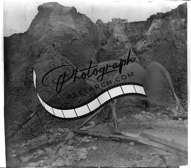 Hydraulic mining - behind the pipes,1866,men working,water spraying