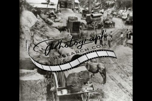 Feeding teams,scene on the Placerville Route,California,CA,1866,people,horses