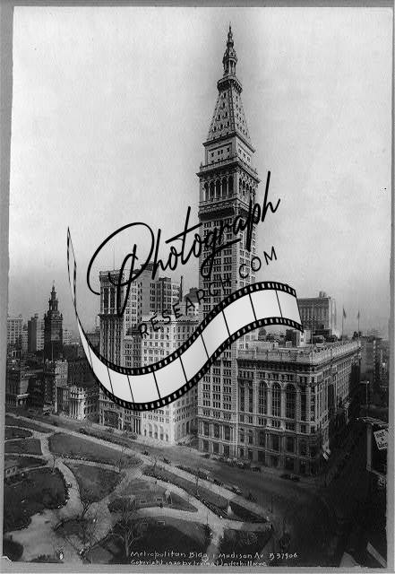 Photo shows the Standard Oil Building (later Socony Oil Building), 26 Broadway, at Beaver Street, NYC. (Built: 1884-86, Ebenezer L. Roberts. Enlarged 1896, Francis H. Kimball. Enlarged 1920-26, Carrere & Hastings). Elevated view across Bowling Green Park; Beaver Street facade at right. This view shows more at right than C 17591: a skyscraper.