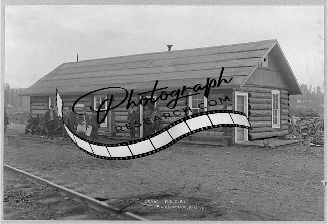 The first depot at Anchorage,Alaska,AK,Railroad Station,RR,Log Building,c1915