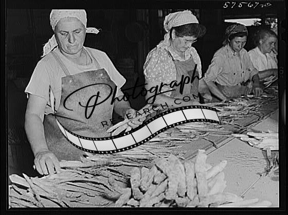 Title: Italian workers from Trenton and nearby areas grading and bunching asparagus in packing house. Starkey Farms, Morrisville, Pennsylvania