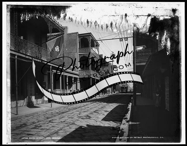 Royal Street,ironwork,buildings,alley,cobblestone,New Orleans,Louisiana,LA,c1900