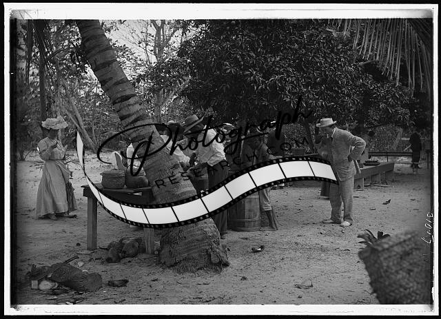 Tourists buying coconuts,fruit,vendor,Nassau,Bahama Islands,West Indies,1900