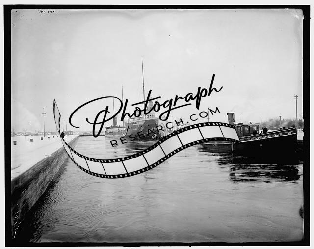 Cargo ship,tug,canal,Sault Sainte Marie Canal,Michigan,Detroit Publishing,1900