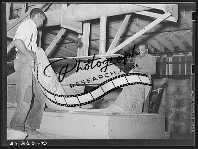 Title: Bringing sack of rice to hundred-pound weight. State rice mill, Crowley, Louisiana