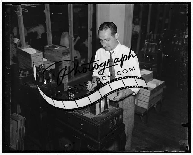 Title: Baltimore, MD. Statistical data of great value in the future will accumulate in the files of the Social Security Board Records Office. To provide easy means of developing and studying this information, without disturbing the permanent records, acturial cards are reproduced from the original employee master cards. The master card is a [...] salmon pink. The acturial card is a bright green. They are of different colors so they will not be mixed together inadvertently. The photograph above shows a reproducing machine making acturial cards from master cards. The punched master card is placed in one compartment. A blank acturial card is placed in another. When the master card has been automatically carried to the proper position it stops, momentarilly. Meanwhile the blank acturial card is carried to another place in the machine. Electrical impulses cause the machine to punch on the acturial card the same holes, in the same position, as on the master card. The two cards are held in place while the part of the machine holding the acturial card telegraphs back to the part holding the master card to see that the punches in each are identical. Then the cards are released, one is in one pile and the other in another. The whole operation requires a small fraction of a minute