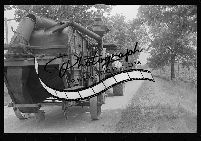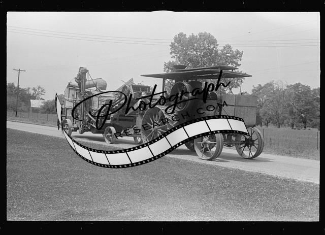 Steam tractor pulling grain separator along country road,central Ohio,OH,FSA,3