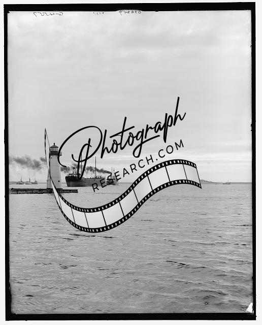 Upper light,sunrise,cargo ships,Saint Marys River,Sault Sainte Marie,MI,1900