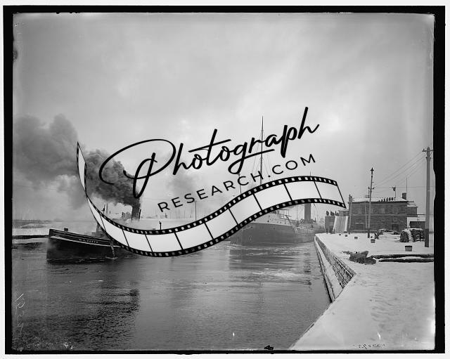 Cargo ship,tug,canal,Sault Sainte Marie Canal,Michigan,Detroit Publishing,1900