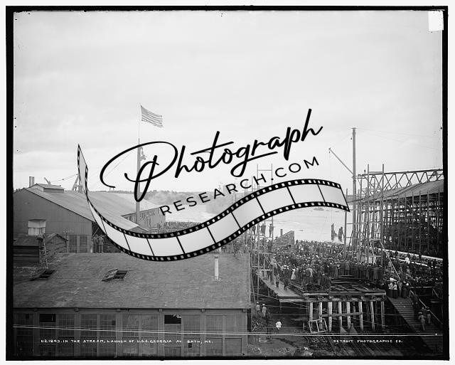Stream,launch,crowds,boats,American battleships,USS Georgia,Bath,Maine,ME,1904