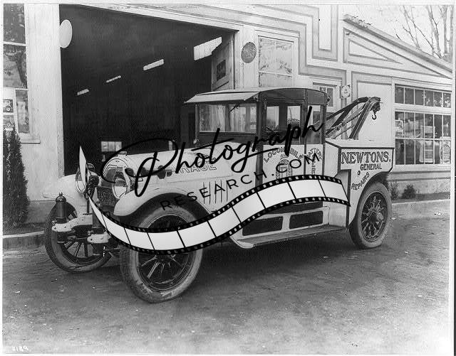 Locomobile tow truck parked in front of garage,1928?,Newton's Garage