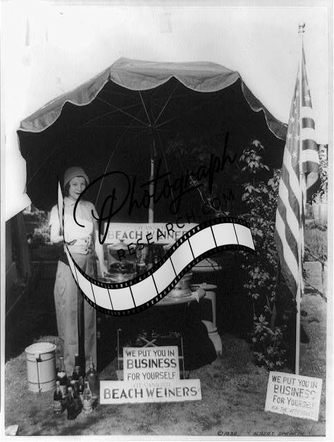 Woman demonstrating steaming hot beach wieners,stand shaded,umbrella,c1932
