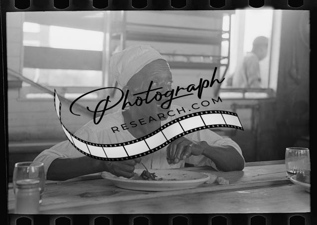 Title: Negro stevedores eating on stern of boat. Food supplied to crew consists almost entirely of carbohydrates with some of the cheaper cuts of meat. Sleeping quarters are not provided for stevedores, who sleep in any available space. Aboard El Rito, Pilottown, Louisiana