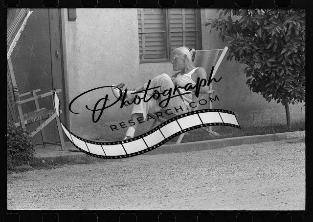 Sun bather swatting fly,tourist court at Phoenix,Arizona,AZ,FSA,May 1940