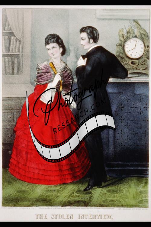The stolen interview,c1872,Currier & Ives photo,man,woman,clock,bookshelf