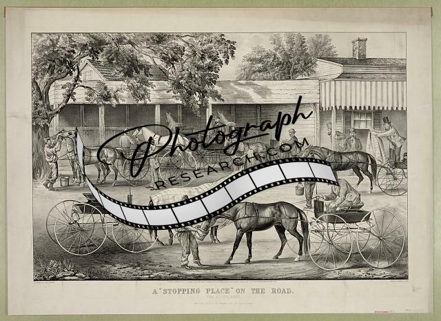 A 'stopping place' on the road: the horse shed,c1868,Currier & Ives Photo,men