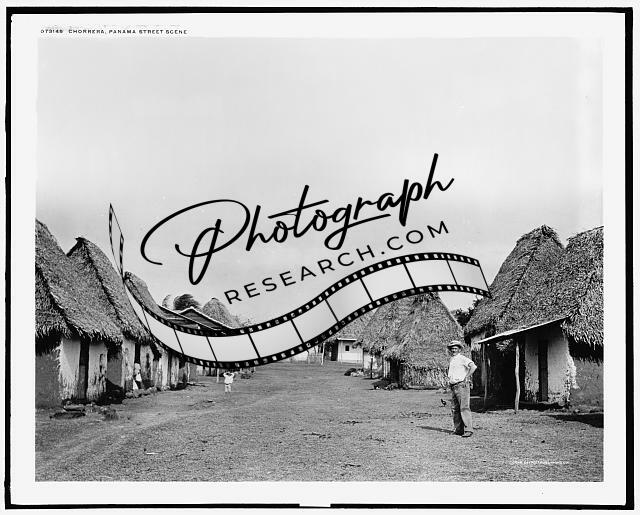 Chorrera,thatched roof structures,dwellings,buildings,Panama,street scene,c1910