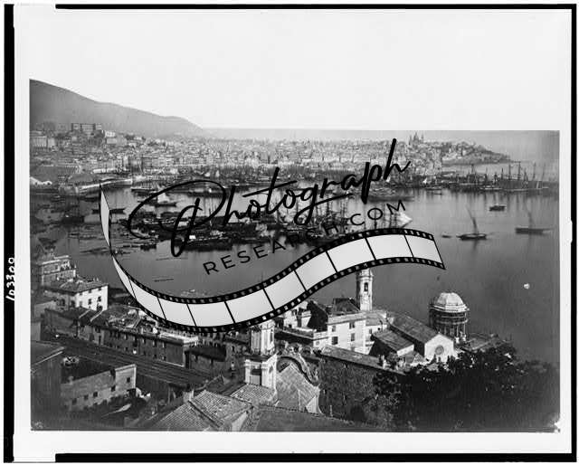 General view,buildings,water,boats,ships,cities,north west,Genoa,Italy,1860
