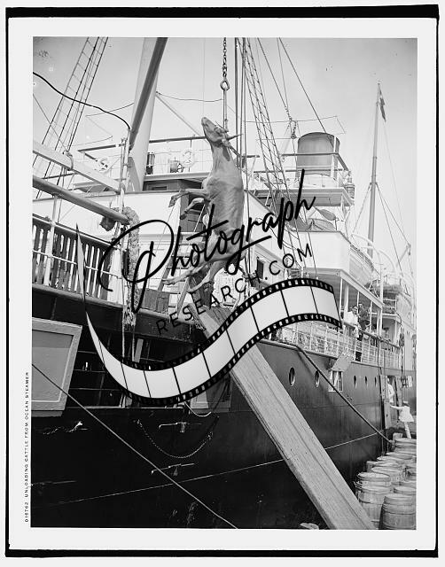 Unloading cattle,ocean steamer,shipping,cows,livestock,Detroit Publishing,1900