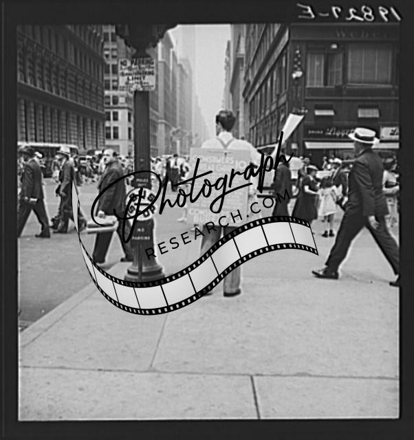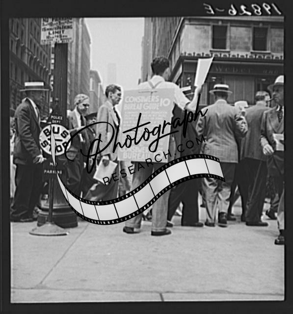 Title: 42nd Street and Madison Avenue. Street hawker selling Consumer's Bureau Guide. New York City