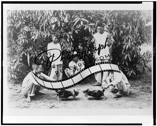 Training cocks,birds,roosters,fighting,animals,betting,gamble,Philippines,1900