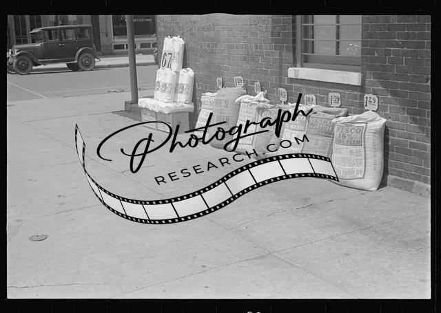 Stock feed in front of feed store,Route 40,central Ohio,OH,Summer 1938,FSA