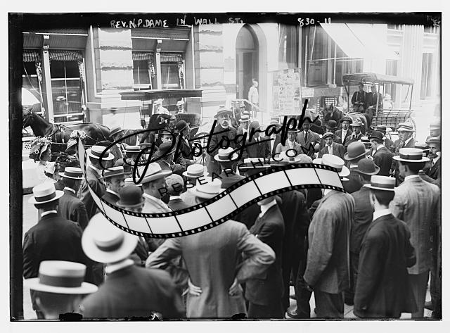 Reverend Nelson P. Dame speaking to crowd on Wall Street,New York,NY,horses