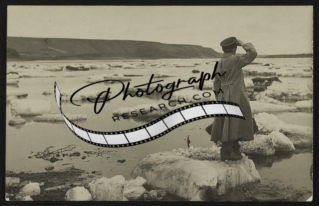 Soldier saluting on iceberg,Enisei River,Siberia,1900-1920,Yenisey River,Russia