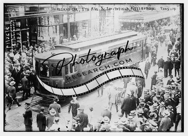 Wrecked streetcar,5th Avenue,crowds,roads,Smithfield,Pittsburgh,Pennsylvania,PA