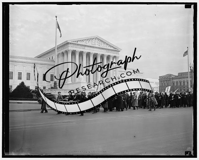 Title: Striking Seamen picket Commerce Department. Washington, D.C. Jan. 18. A cold drenching rain failed to dampen the spirit of nearly 500 east coast seamen from Baltimore, Philadelphia, New York and Boston, as they picketed the Commerce Department today as a protest against provisions of the Copeland Safety-At-Sea Act