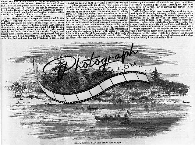 Umpqua Village,half mile below Fort Umpqua,Oregon,OR,Boats on Water,1858