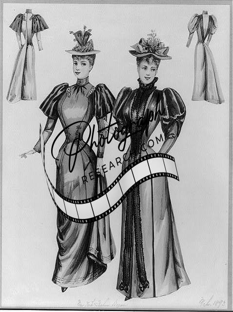 Two women wearing fashionable,dresses; back of each dress is also shown,1893