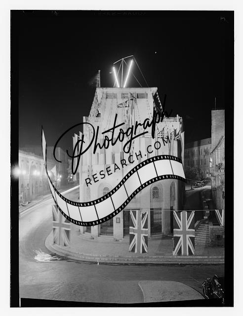 Barclay's Bank building covered with British flags,1945?,Jerusalem,Israel
