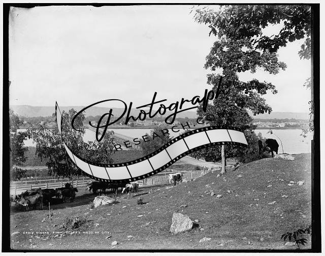 Bluffs west,city,cattle,rivers,cows,Mississippi River,Winona,Minnesota,MN,1880