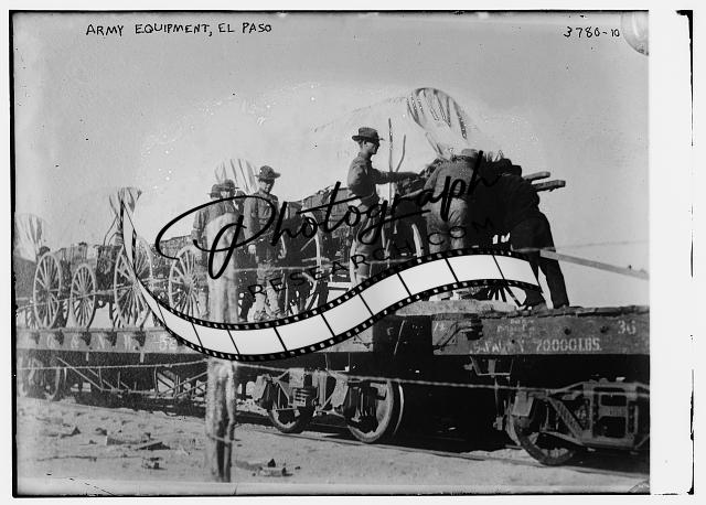 Army Equipment,El Paso,Covered Wagons on Train cars,RR,Men,Locomotive
