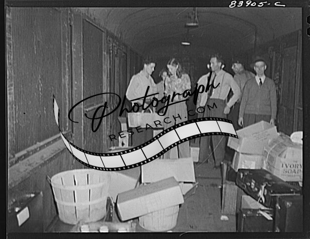 Title: Summersville, West Virginia. Boys and men arriving at train which will carry them to New York state to work in the harvest
