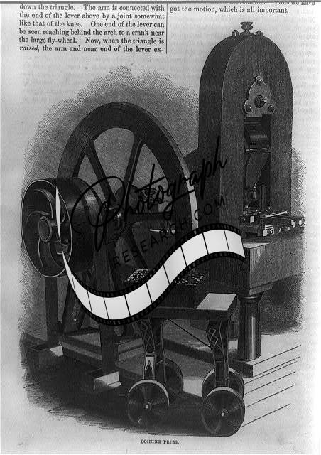 Coining press,machinery,Harper's monthly magazine,equipment,currency,tools,1861