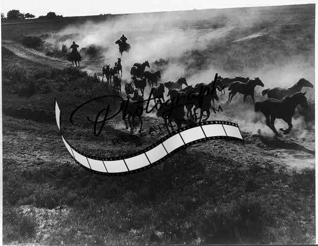 2 cowboys rounding up herd of 21 wild horses,Dust,Field