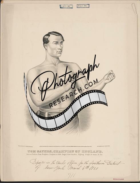 Tom Sayers, champion of England: born at Pimlico, near Brighton, England, in 1826, height 5 feet 8 inches, fighting weight, 10 stone 10 lbs.