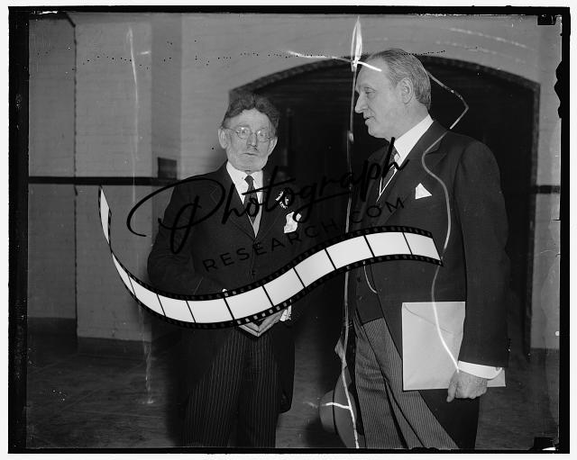 Title: Sworn in as administrator of Public Contracts Division of Department of Labor. Washington D.C. L. Metcalfe Walling was today sworn in as Administrator of the Public Contracts Division of the Department of Labor which is enforcing the provisions of the Walsh-Healy Act. Walling has been Director of the State Labor Department of Rhode Island for two years. In the photograph, left to right: Secretary Perkins, L. Metcalfe Walling, and Samuel M. Gompers, Chief Clerk of the Departement of Labor administering the oath