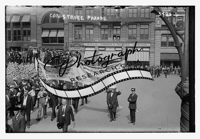 Street car strike parade,Johnson & Faulkner store front,people carrying sign