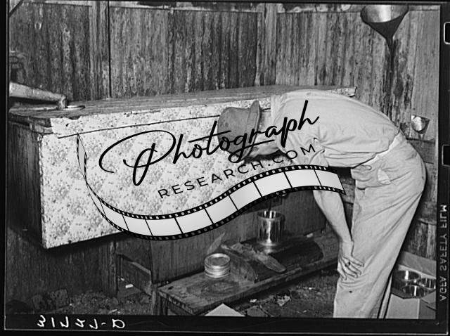 Title: Pressing top onto tin can full of syrup. Syrup mill near New Iberia, Louisiana