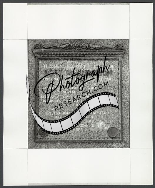 Photograph shows plaque located at the Morris-Jumel Mansion that reads "Washington's Head-Quarters. This tablet is dedicated by the Washington Heights Chapter Daughters of the American Revolution to the memory of General George Washington who occupied this mansion as his head-quarters from September 16th to October 21st 1776. Battle of Harlem Heights, September 16th. Councils of War. President Washington visited this mansion accompanied by his cabinet July 1790. Morris House 1758, Jumel Mansion 1810, Earle Cliff 1900."