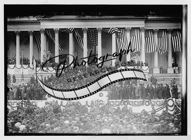 Taft on Inaugural platform,flag-bedecked podium,crowd