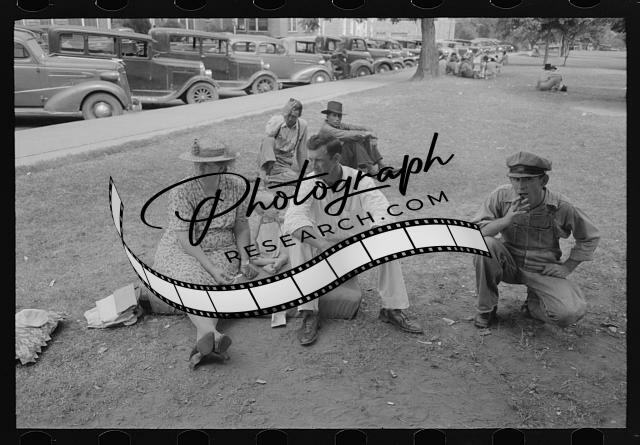 Title: Farm people on lawn in front of courthouse, Saturday afternoon, Tahlequah, Oklahoma